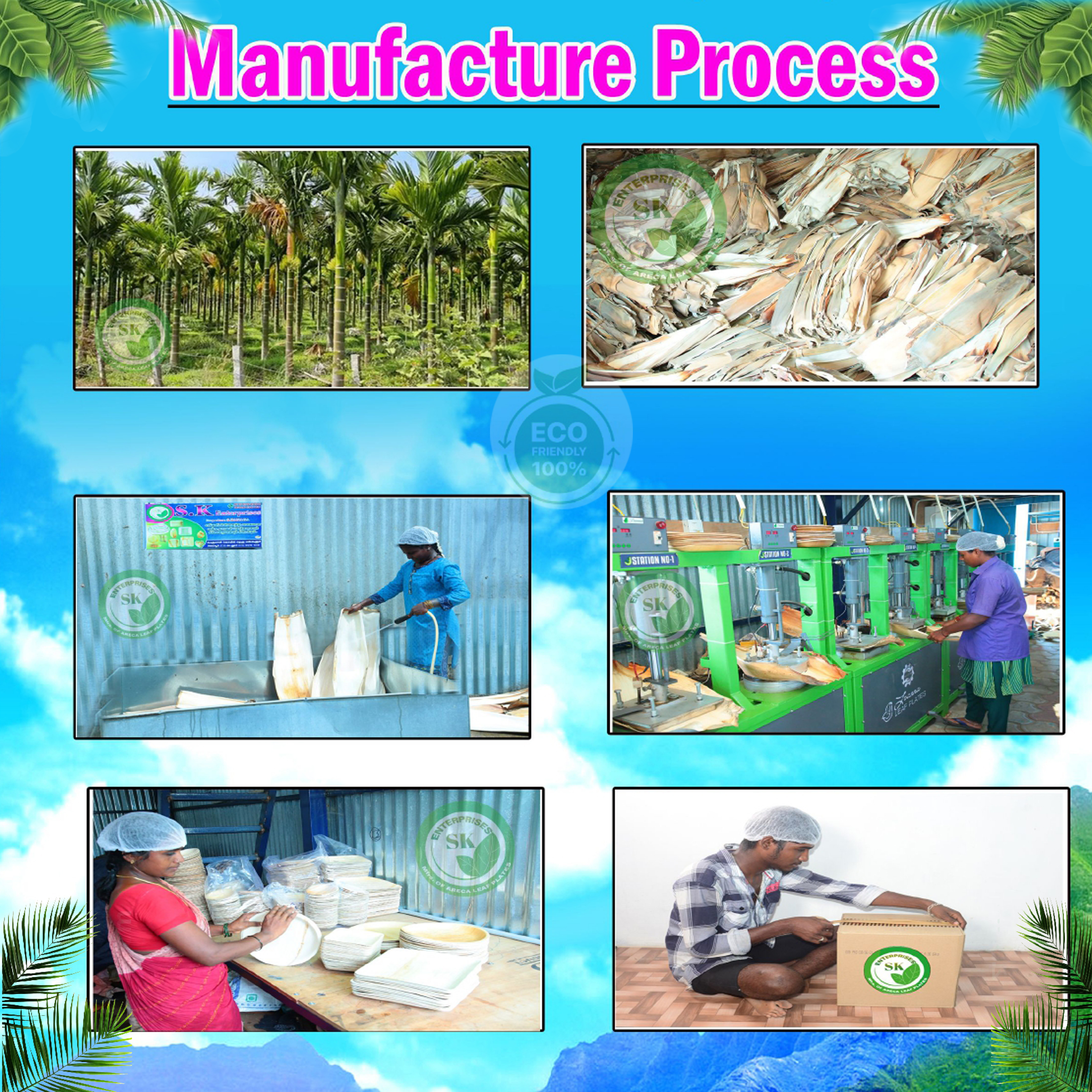 Situated amidst verdant surroundings, our manufacturing facility is designed to minimize environmental impact. Equipped with state-of-the-art machinery, our skilled artisans meticulously transform responsibly sourced fallen Areca Areca leaves into high-quality plates.